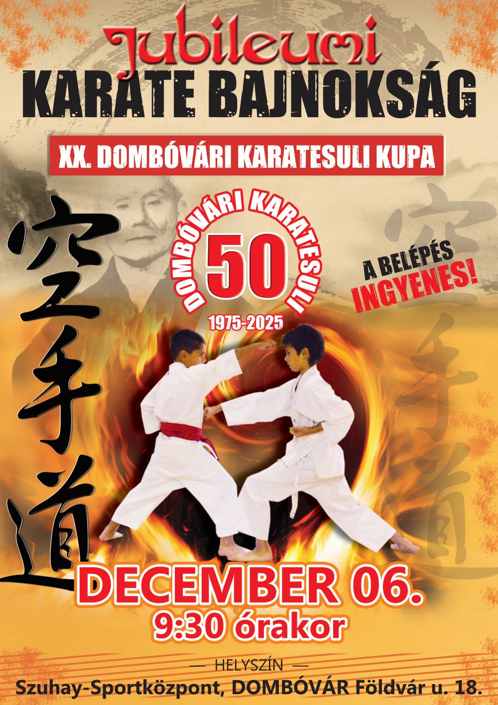 2025.12.06. XX. Dombóvári Karatesuli Kupa >kép> Kettős jubileumot ünnepelhettünk, ugyanis városunkban a karate 50 évvel ezelőtt jelent meg Györe Pista bácsi vezetése mellett, a Dombóvári Karatesuli pedig bejegyzésének a 20 éves évfordulóját ünnepelhette.